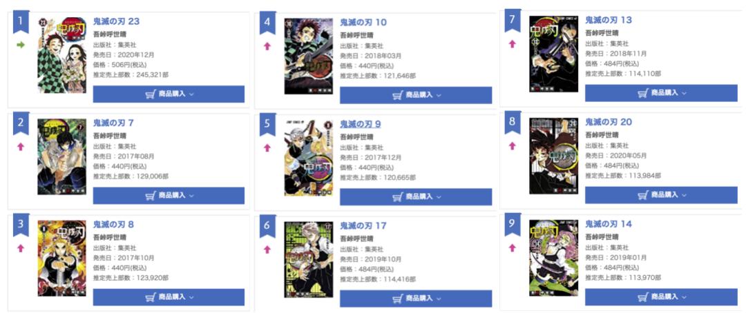 而无论是纸质出版市场还是电子出版市场,漫画部门贡献最大的是《鬼灭之刃》。据Oricon12月最新一周的销量排行榜来看,销量前16的都是《鬼灭之刃》,只在第17位是由荒川弘作画的《亚尔斯兰战记》第14卷,之后到23位也全是《鬼灭之刃》。其中,本周销量第一的自然是《鬼灭之刃》第23卷,截止至目前共售出24.5万余册。