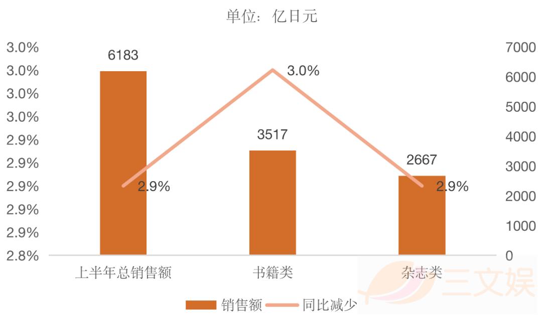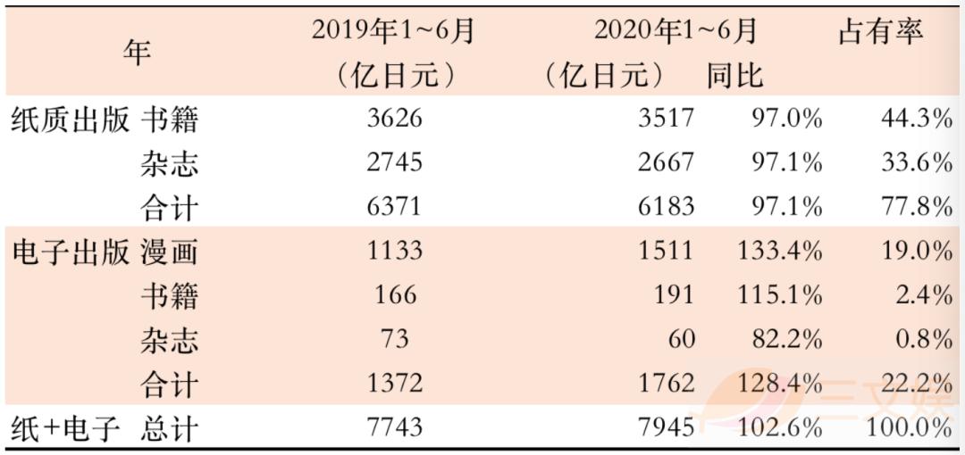 2020年上半年,日本的纸质出版物销售额同比减少2.9%,为391.07亿元(6183亿日元)。其中,书籍类的销售额减少3.0%至222.45亿元(3517亿日元),杂志类(包含漫画)销量同比减少2.9%至168.69亿元(2667亿日元)。