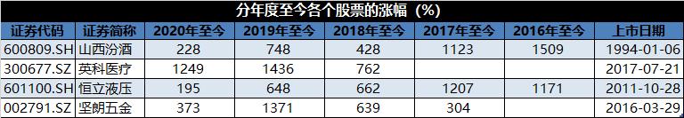 跟大家印象里不太一样的是,十倍股,真的是太稀缺了。从2016年至今,都快5年了,满打满算只有4只10倍股,其中从2016年至今,山西汾酒和恒立液压涨幅超过10倍,从2019年至今,又出现了2只10倍股,英科医疗和坚朗五金,严格意义上,今年的10倍股只有一只,那就是英科医疗。