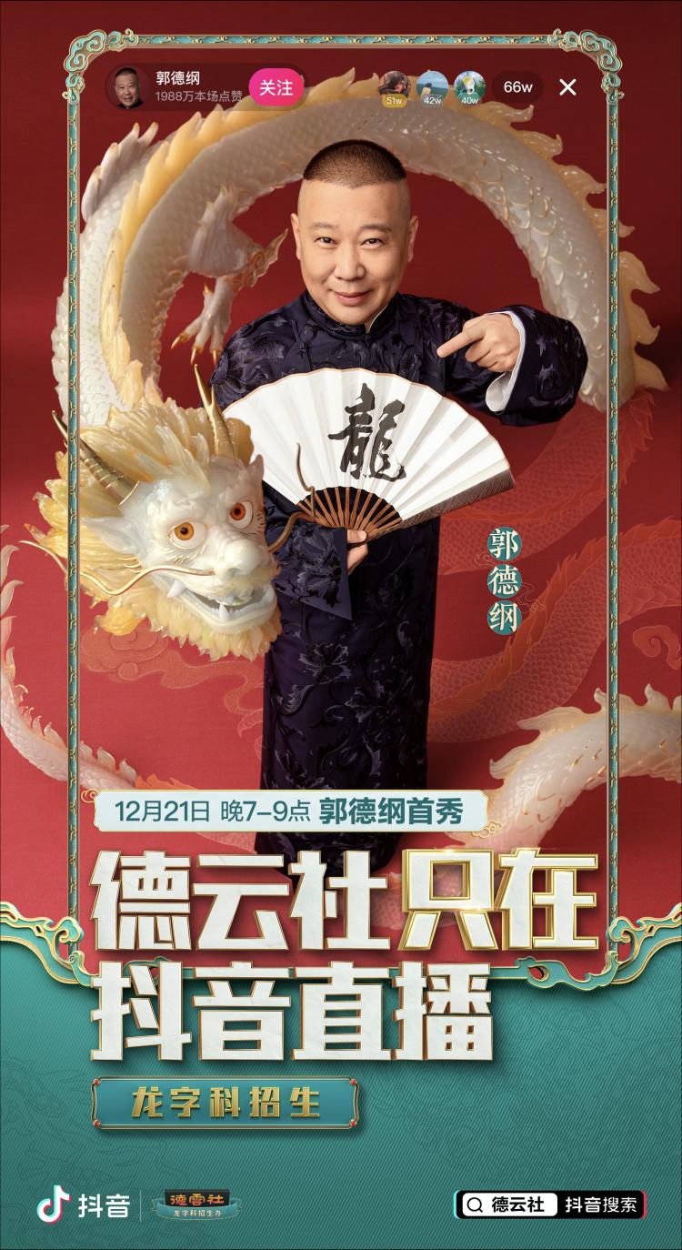 这次直播的主题——德云社龙字科招生,本身就是对“传承”很直观的一个表现。事实上与抖音的合作还未官宣前,郭德纲就曾透露这次招生的重要性,这一方面表现在龙字科将会是他最后一次大规模招生,另一方面,郭德纲还表示会亲自教这届徒弟。