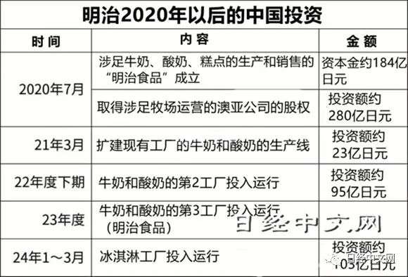 日本明治为了在中国构建生产基础,正在积极推进投资。除了新工厂的建设之外,还向在当地涉足牧场运营的企业出资,并推进符合当地消费者偏好的商品开发,借此加快中国业务的拓展。明治提出的目标是使2019年度仅为约5%的海外营业收入比例到2026年度提高至10%以上。为了达到这一目标,在经济最先摆脱新冠状疫情打击的中国扩大业务不可或缺。