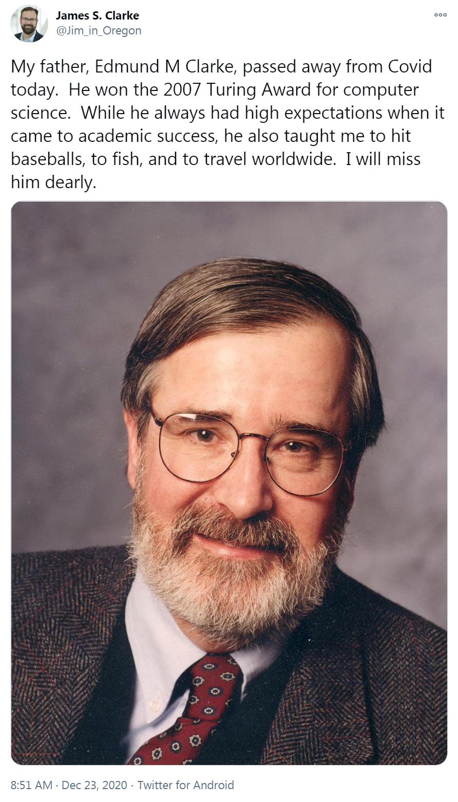 他的儿子James Clarke在推特上发布了这一消息。在推文中,James Clarke说:「今天,我的父亲爱德蒙·M·克拉克因为新冠肺炎去世了。他是2007年图灵奖获得者。父亲对我的学术研究一直寄予厚望,他还教我打棒球,钓鱼,环球旅行。我将会深切怀念他。」