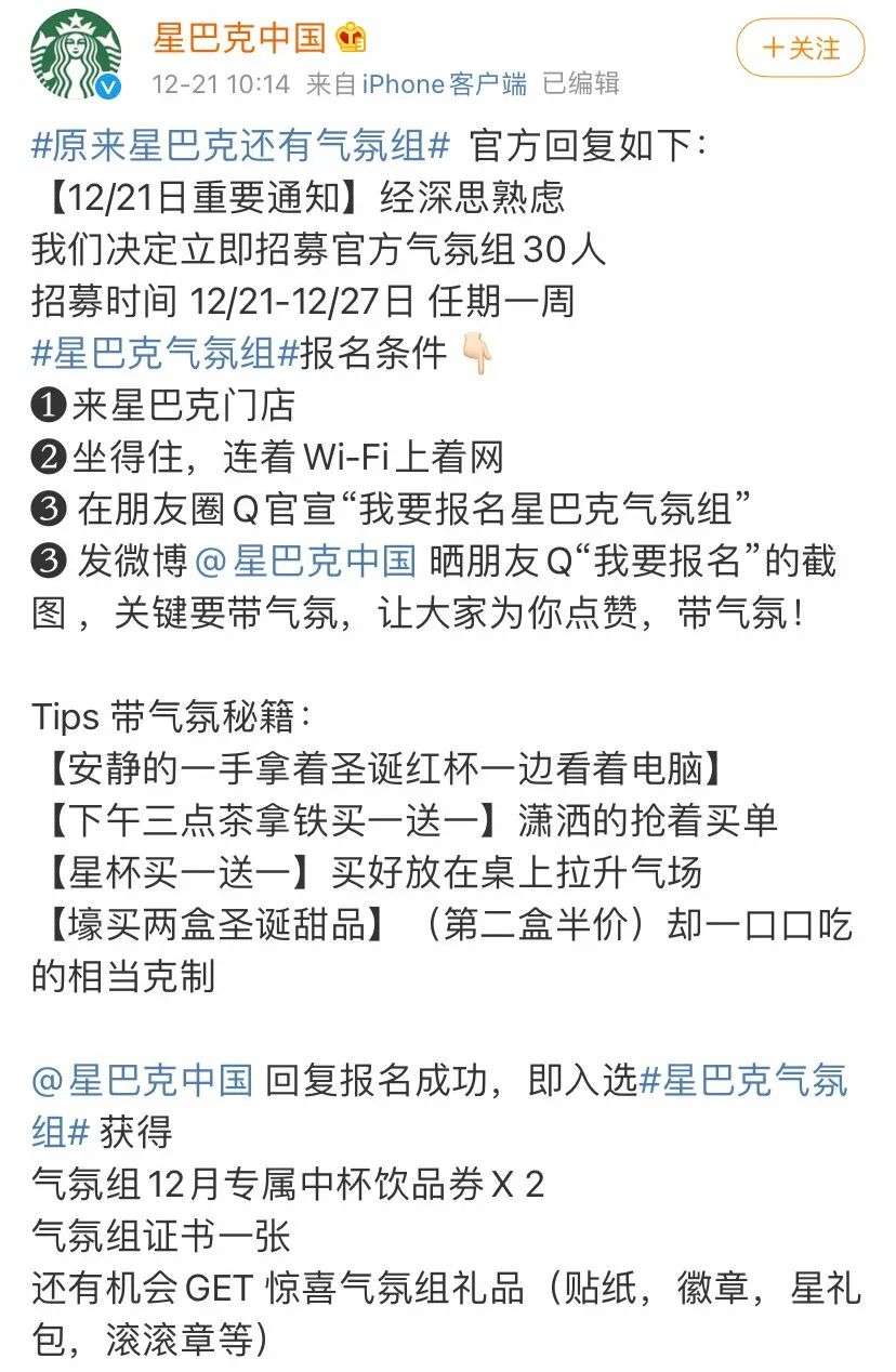 趁着#原来星巴克还有气氛组#话题的大热,星巴克官方微博及时接梗,给出“决定招募气氛组”的官方回复,成功营销了一波,赚足眼球。