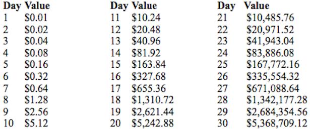 想象一下,现在给你一个选择——要么马上得到300万美元的现金;要么得到1分钱,但这1分钱在接下来的30天内里每天价值翻倍。你会选择哪一个?