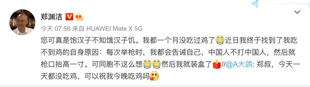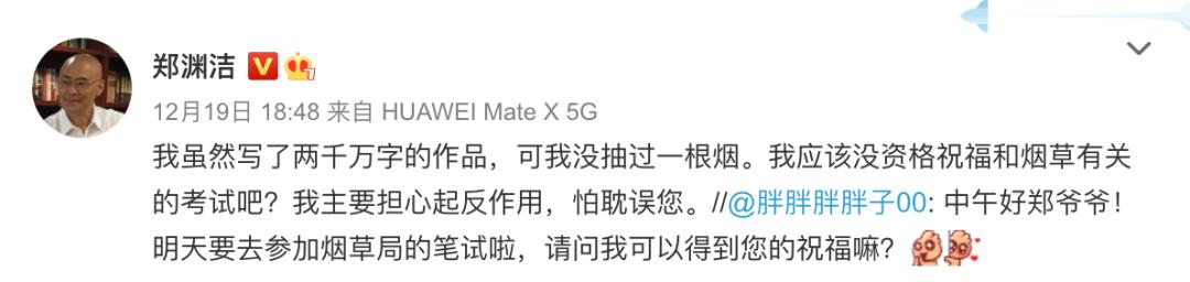 @ 嘿你这孩砸:郑爷爷,这个月26号我就要考研啦~小时候看过您的书,请问您可以为我加油吗?@ 郑渊洁:祝你考研成绩全国第二。我在抖音祝过一位读者考研全国第一了。抱歉。