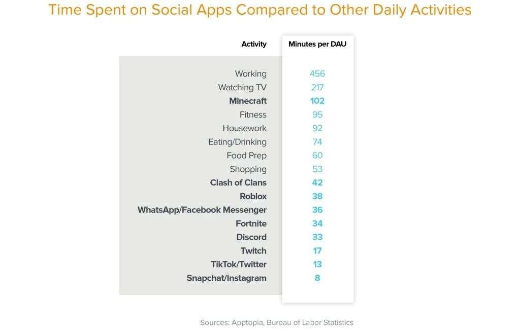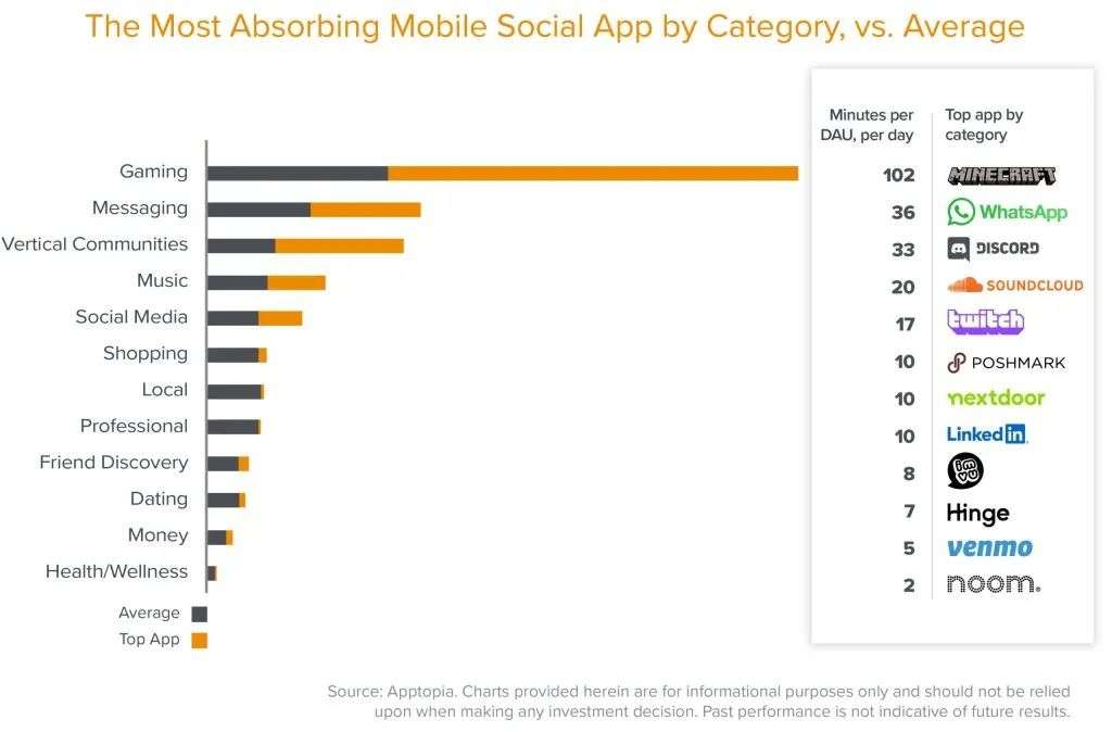 在注意力的捕捉方面,我们了解到很多人倾向于将手机时间用于:玩游戏、给朋友发信息、在Discord上谈论游戏以及听音乐。Minecraft每天能从玩家身上获取超过100分钟的注意力,令人印象深刻。这几乎是WhatsApp(参与度第二高的应用)的三倍,这也说明了玩家可能玩这个游戏不仅获得了乐趣,而且是利用这个游戏社交,所以参与度超级高。
