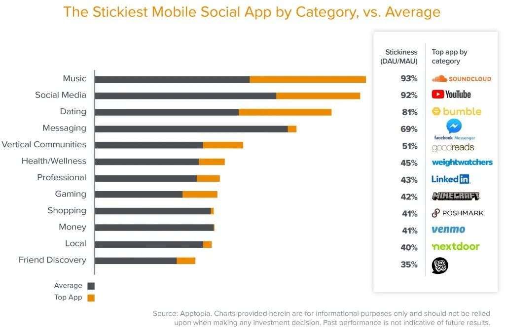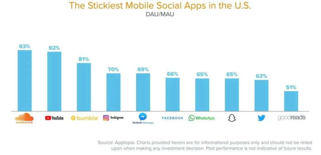 但是,DAU/MAU虽然是一个重要的参与度指标,但它仍然不能覆盖所有类别,说明整个故事。特别是对于社交应用来说,DAU/MAU还是一个比较间接的指标。例如,与那些只在网页端看YouTube视频或听SoundCloud音乐的用户相比,专门下载SoundCloud或YouTube移动应用的用户可能会听更多音乐、看更多视频。因此,在社交中,围绕媒体消费的DAU/MAU水平往往最高:听音乐、看视频、玩游戏或随时刷新有信息流的社交媒体。