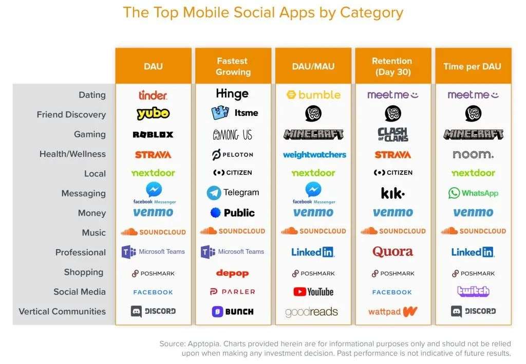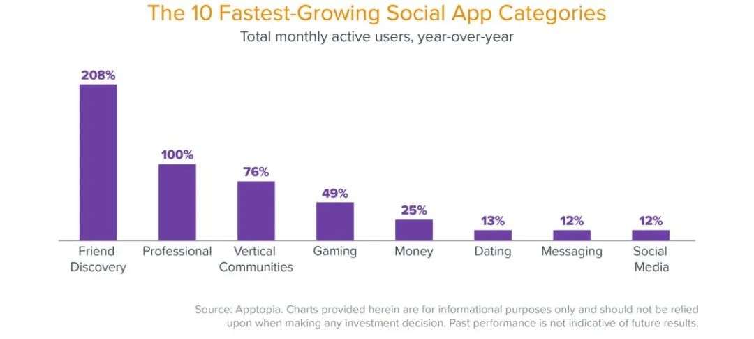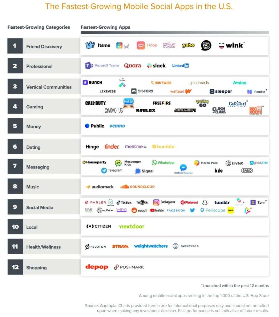 尽管社交媒体巨头们可能已经获得了网络效应,但对增长最快的社交应用进行分类观察,能为下一个爆款应用可能出现的地方提供有趣的信号。