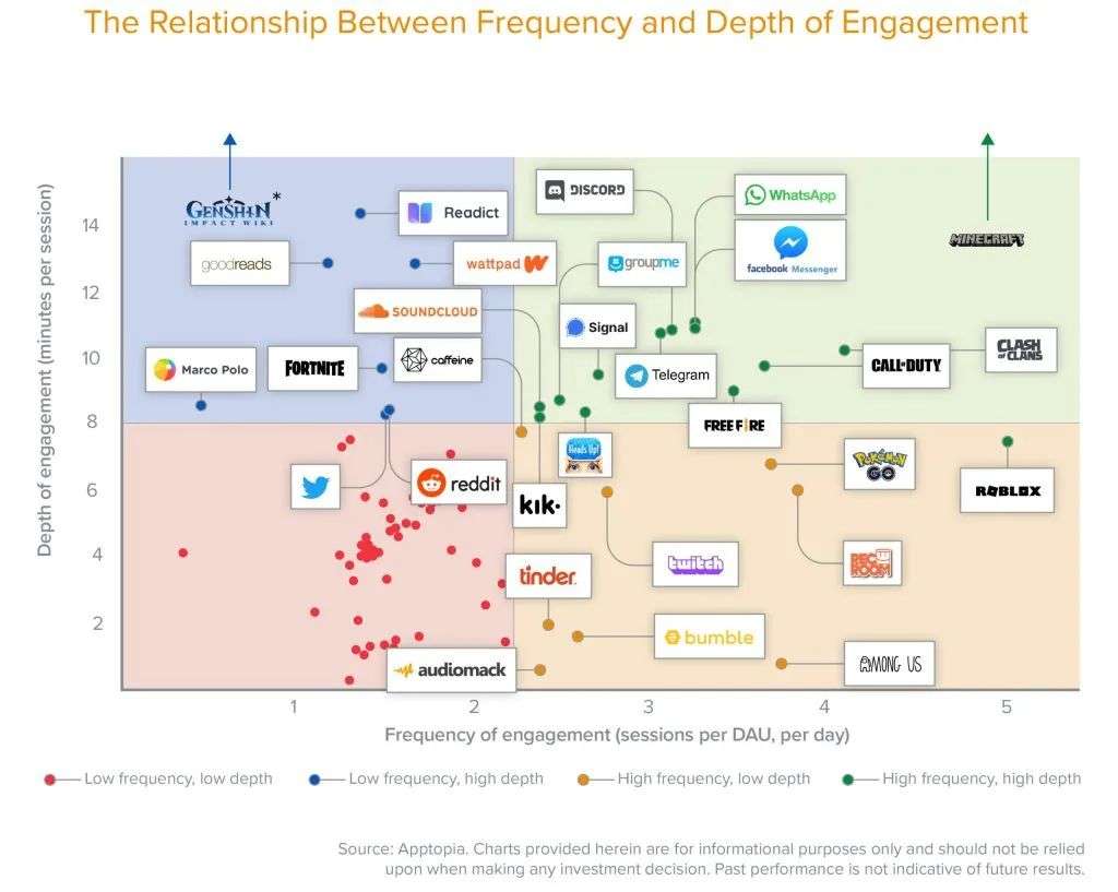 可见,参与的深度不一定等于粘性。同样,并不是每款应用都要每天使用才有价值。有些应用在用户高度活跃的使用中茁壮成长,但它的用户使用的深度是有限的。这种现象可以在Bumble和Tinder等约会应用上看到。平均而言,用户使用约会应用的频率相对较高,每天2.5次,但每次打开可能只持续一到两分钟。相比之下,像Goodreads、Wattpad和Readict这样的垂直阅读和写作社区的打开频率较低,每天1到2次,但每次打开平均超过13分钟。尽管频率相对较低,但这些用户仍然在应用中花费了相当多的时间,这表明他们从这个社交网络中获取了有意义的价值。