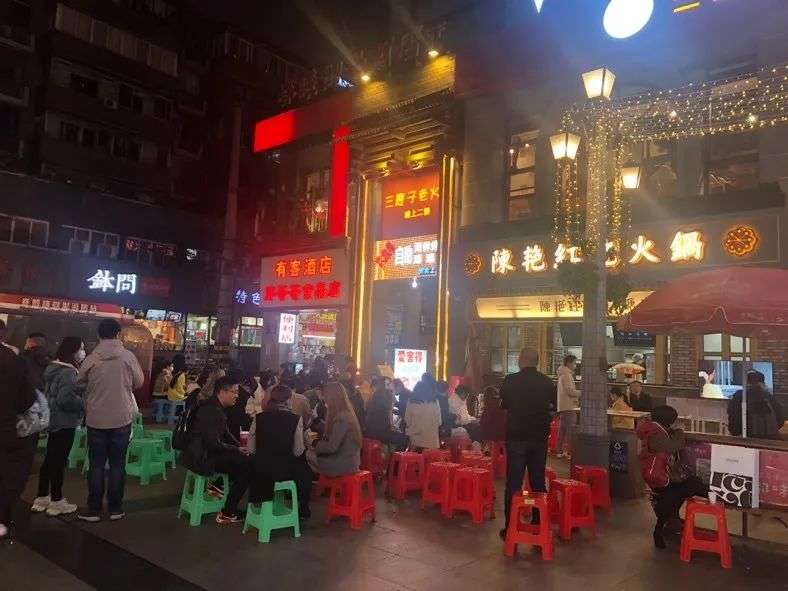 夜幕降临,气温降至10度以下,晚上8点左右就餐高峰正慢慢过去。此刻,在成都春熙路附近的一家老火锅店门口,却依旧排着近百号人,塑料凳整齐地摆了5排,将步行街道占去了一大半。
