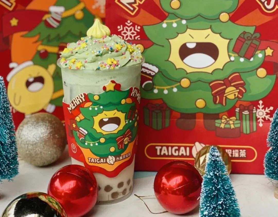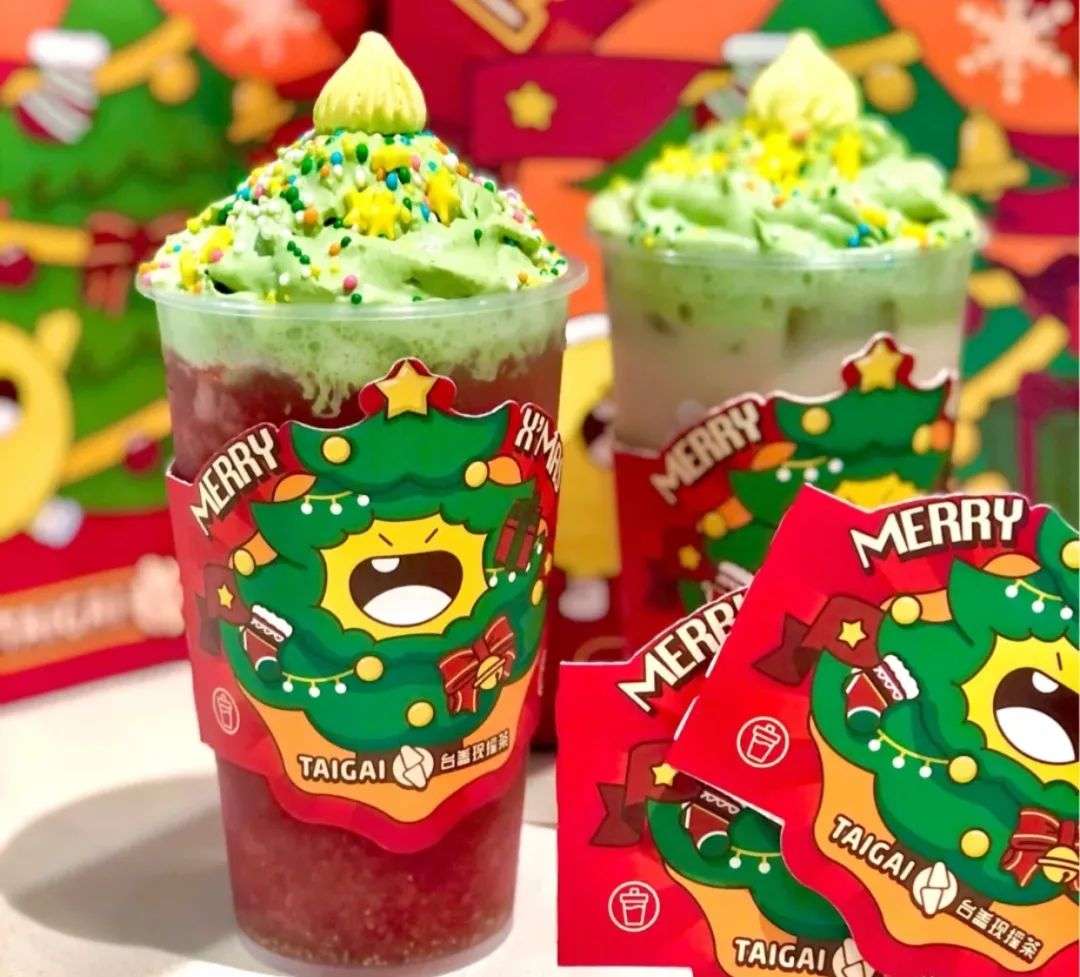 比如,最近台盖推出的圣诞树奶茶,用抹茶奶油顶、星星、彩球糖,做出圣诞树的造型,锚定一个节日经典符号,吸引一大波小红书女孩打卡。