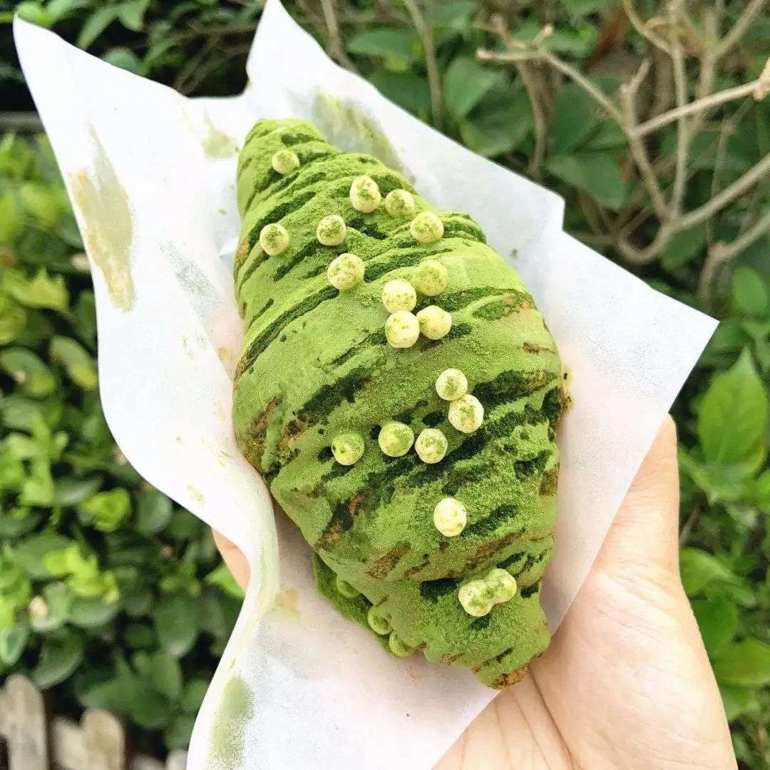 比如奈雪的抹茶咩咩包,在常见的可颂面包内加入抹茶奶油馅,外皮用白巧克力脆珠搭配抹茶粉,微苦和清甜一同入口,从视觉到味觉都给人惊喜。
