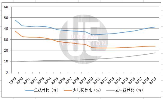△ 过去20年中国总抚养比与少儿、老年抚养比变化趋势图 数据来源:国家统计年鉴