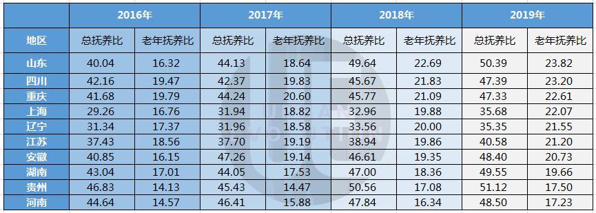 △ 2016年-2019年十个省份抚养比数据 数据来源:国家统计年鉴