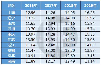 从比例来看,辽宁、上海、重庆三个省份在2017年率先达到14%。