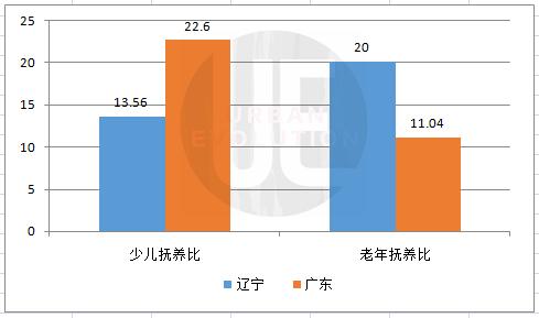 比如2018年的辽宁和广东,虽然两个省份总抚养比都是33%,都是10个劳动力对应3个被扶养人。不同的是,辽宁养的是1个孩子、2个老人,广东养的是2个孩子、1个老人。