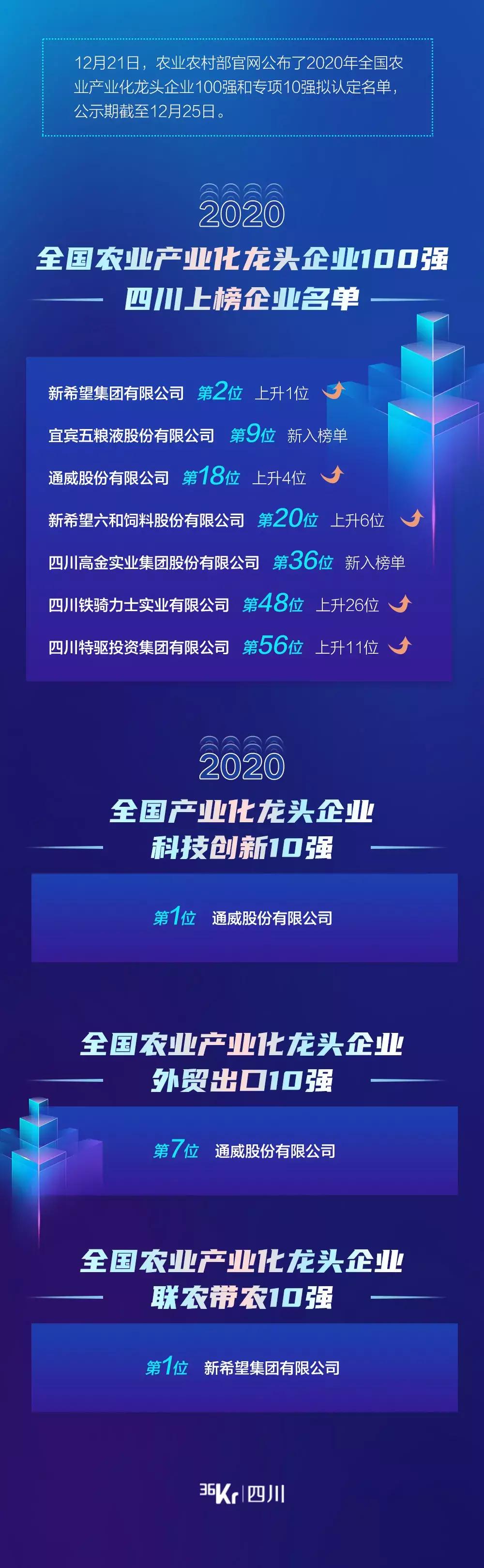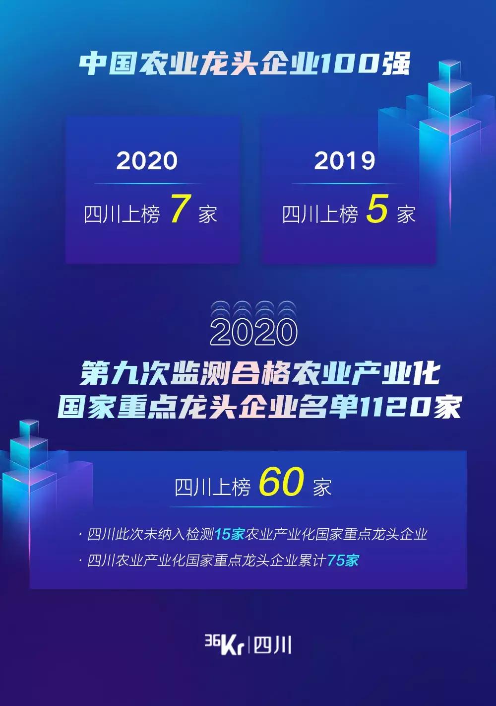 昨日,农业农村部发布了2020年全国农业产业化龙头企业100强和专项10强拟认定名单,公示期截至12月25日。和2019年相比,四川有2家新公司杀入百强名单,共计7家企业入选。此外,此前发布的2020年第九次监测合格农业产业化国家重点龙头企业名单1120位中,四川有60家企业通过检测。