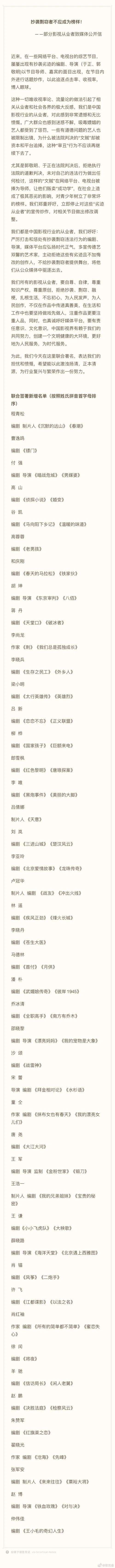 22日,又有45位编剧加入抵制郭敬明和于正的行列,加上之前的111位,一共有156位加入了反方阵营。