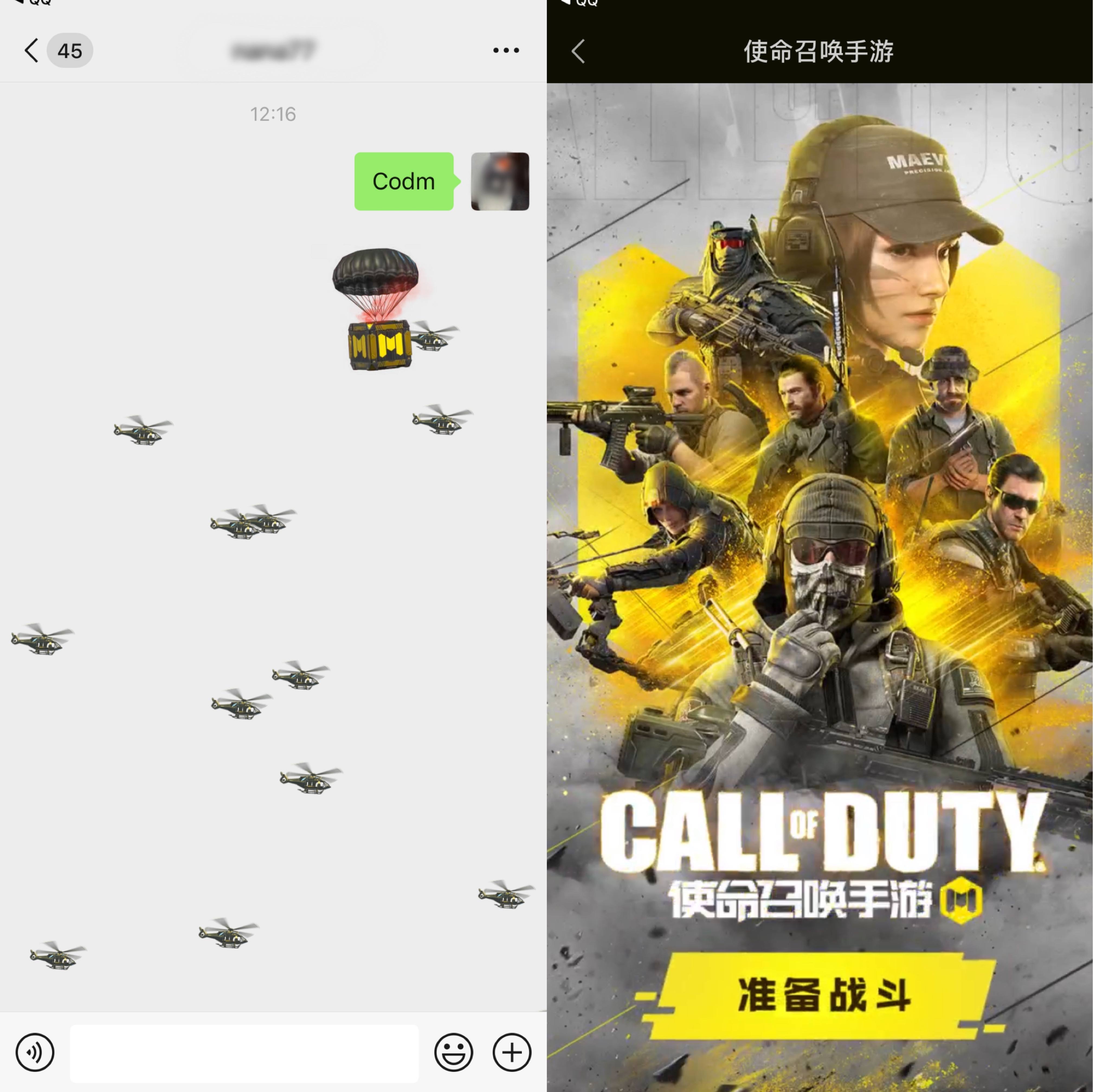 用户在微信聊天框输入 “使命召唤”或者英文缩写“CODM”,就能触发微信彩蛋特效,从屏幕上方掉落《使命召唤手游》的飞机和空投。同时,用户点击屏空投图标,还会直接跳转到《使命召唤手游》的下载界面。在手机QQ发送关键词,也会触发类似特效。