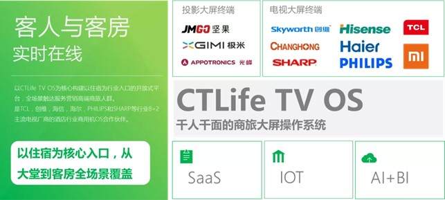 携旅开放平台「Htrip CTLife Open Platform」是作为生态体系的中枢,通过将商用OS、AI、IoT、Data技术平台化,支持快速搭建商业场景下的AIoT相关应用。基于该平台,携旅Htrip掌握的核心TV OS和AIoT协议、HIV算法拥有低成本、高性价比的优势。TV OS支持市场主流电视厂商的安卓智能机型,IoT协议可支持语音智能、客控等近百个厂商生产的智能硬件在商业环境中稳定运行,应用TV OS和AIoT协议和算法的携旅Htrip可以提升产品进入产业商用时效2/3以上。