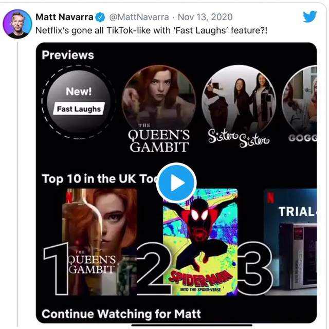 在国外网友Matt Navarra发布的Twitter里,我们看到Netflix正在测试一款名为「Fast Laughs」的功能。它截取了Netflix节目中15秒到45秒的视频片段来吸引用户点击。最近大火的原创剧《后翼弃兵》也在其中。