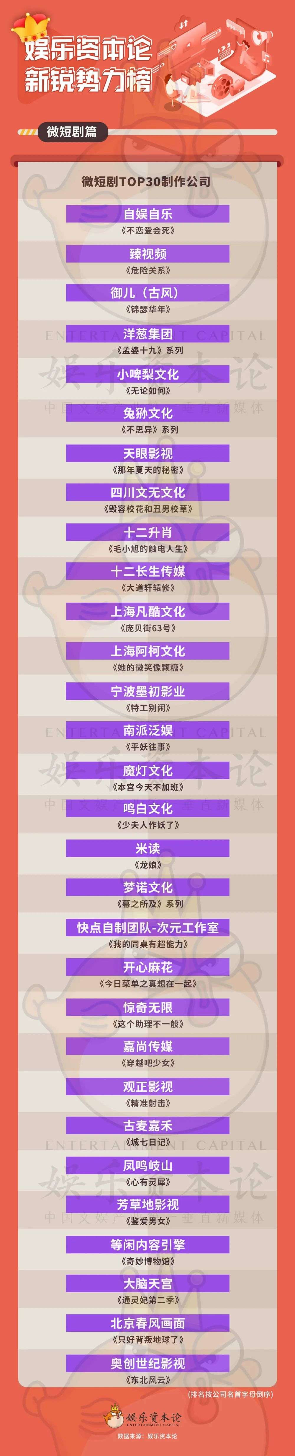 近期,娱乐资本论推出了“新锐势力榜之微短剧TOP30”,盘点了微短剧(特指10分钟以内的剧)行业的30家新锐制作公司,展示出当前行业内微短剧制作的方向和可能性。