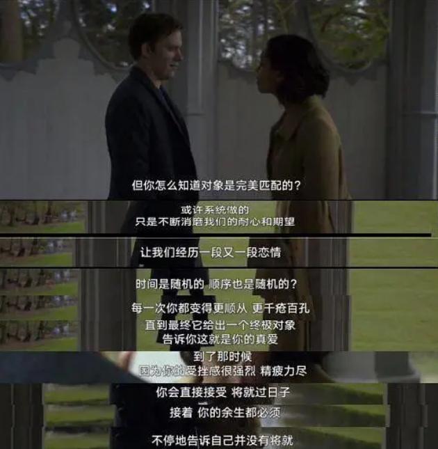 最终,AI婚配不过是给很多不愿为恋爱、婚姻付出时间和精力的年轻人,多了一个可以“分担责任”的参考意见,这个匹配结果可能成为很多人将就进入婚姻的借口而已。就像英剧《黑镜》第四季《Hang the DJ》当中,女主对那个完美结婚对象的怀疑一样,这究竟是不是在被算法设定之后的一种妥协呢?