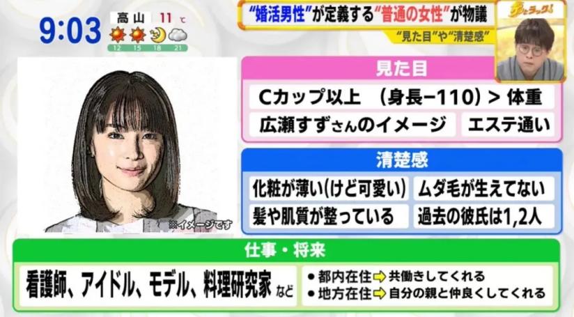 根据日本媒体TBS对男性和女性择偶观的调查,日本女性已经从平成时代的“三高”(高学历、高收入、高身材)降低到2008年后的“平凡男子”(收入平均、工作平稳、性格平稳)的标准,但仍然出于对婚后生活质量和育儿成本的考虑,会要求男性要达到一定的收入标准,但现实是只有少部分男性能够达标。