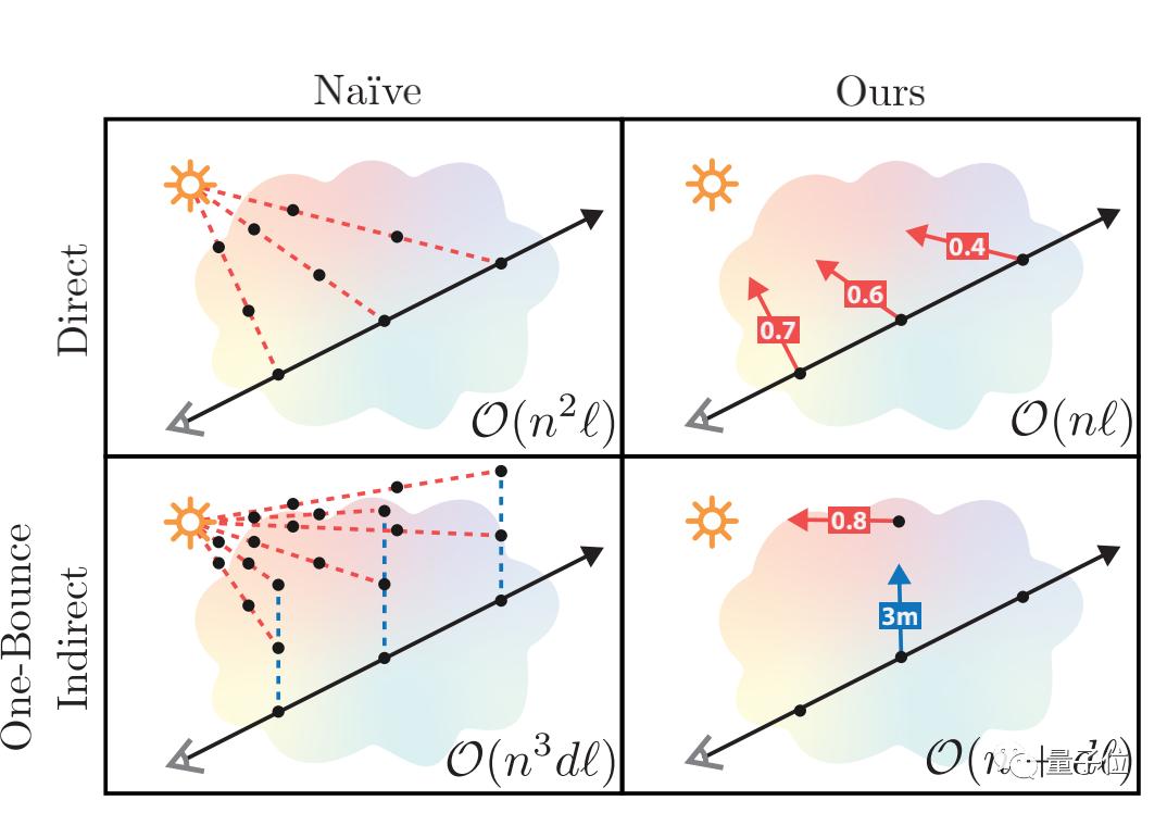这种方法,大大降低将直接照明和间接照明的计算复杂度,使得在优化连续照明场景表示的训练循环中,可以同时模拟直接照明和其反弹的间接照明。