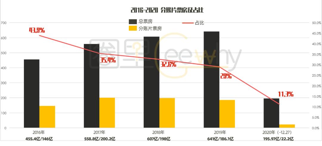 不出意外的话,2020年进口分账影片(也就是我们通常所说的“进口大片”)总票房不会超过23亿,占比不足12%,是最近十余年来的最低成绩。今年将没有进口片能进入全年票房前十(《信条》很快会被《拆弹专家2》超过),从圈里GeeWhy能找到的数据来看,这同样是1995年至今25年来最差的成绩。