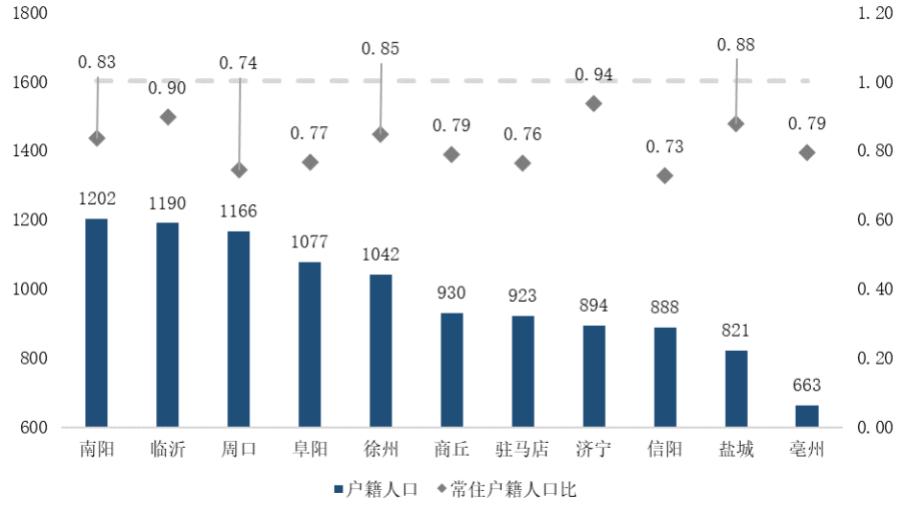 截至2019年底,南阳、临沂、周口、阜阳、徐州户籍人口均超过千万人,其中南阳超过1200万人,是河南省人口第二大城市。此外对比年末户籍人口与常住人口,11个城市常住户籍人口比普遍在0.8上下,周口、信阳常住户籍人口比更是低至0.73,2019年人口流出分别达300万人和242万人。