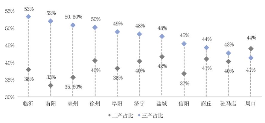 产业结构方面,11个典型城市基于人口与地理优势大多具备丰厚的工业基础,如周口锅炉、盐城汽车、商丘煤炭等。也正因如此,11城2019年第二产业产值占GDP比重多在40%以上,其中周口更是高达44%,超过该市第三产业产值占GDP比重。在这一类以第二产业尤其是工业、制造业为支柱的城市中,临沂、南阳、徐州产业转型相对较快、完成度相对较高。3城2019年第三产业产值占GDP比重均超过50%,其中临沂占比达到53%。