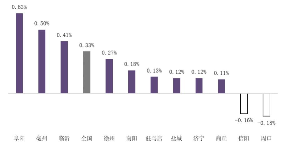 户籍人口大于800万人且常住户籍人口比低于1的城市以及部分重点关注城市,包括徐州、盐城、临沂、济宁、阜阳、周口、商丘、驻马店、南阳、信阳、亳州共11城,是人口流出下的皖北、豫南、苏北、鲁南等区域房地产市场的典型代表。