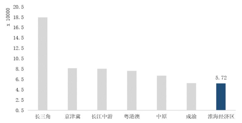 由于产业结构仍以农业主导,淮海经济区面临经济短板,基本面显著落后于长、珠三角。截至2018年数据统计表明,淮河经济区GDP总量57193亿元,不足长三角GDP总值184649亿元的1/3,较之京津冀GDP总量86213亿元和粤港澳GDP总量81049亿元也有明显差距。考量到其“农业大省”的战略定位短期内难以扭转,经济发展后劲略显不足。