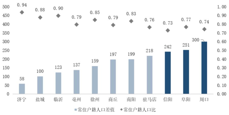 2、人口基数:信阳、周口常住人口负增长,每年超200万户籍人口外流