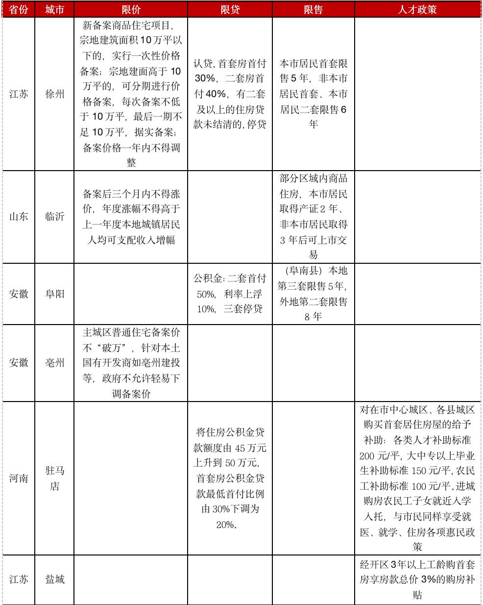 山东临沂出台了限价和限售,手法常规,力度较弱;安徽阜阳则出台了限贷和限售。驻马店和盐城则适时推出了降低预售门槛、购房补助等利好新政,为市场减压、房企纾困。余下城市诸如南阳、信阳、周口等城市调控力度相对温和,不限购、不限售。
