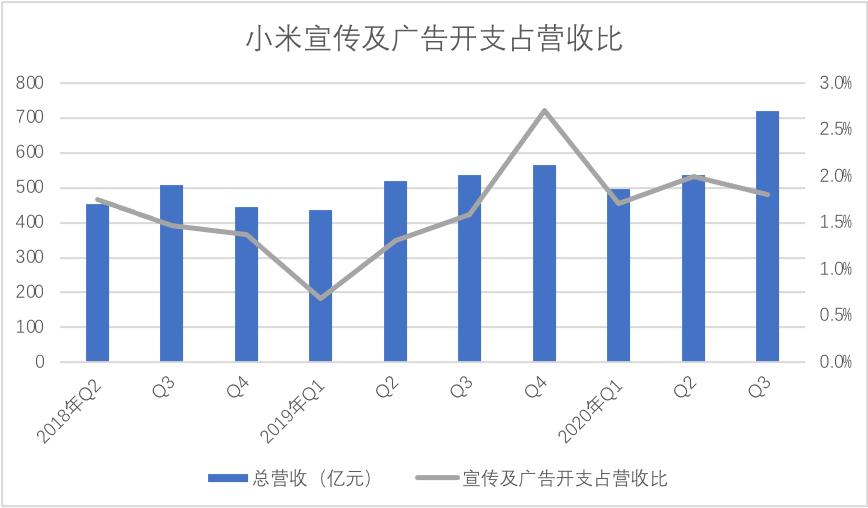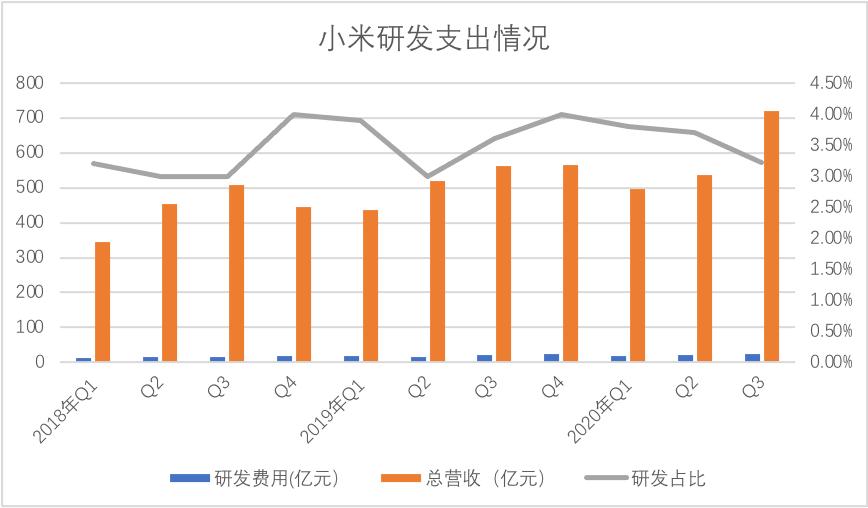 雷军此前宣布小米2020年研发支出将达到100亿元,2020年Q3研发占比支出为3.2%,就此方面来看,小米在研发或者对未来的积极性方面要比同类企业更为激进。