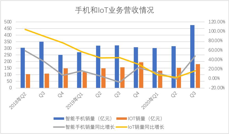 但到了2019年Q3之后,上图中双方增长越发靠拢,2019年Q4手机业务增长迅速反弹,与IoT增长几乎重合,其后两者保持了几乎一致的增长速度,到2020年Q3,手机业务甚至超过了IoT。