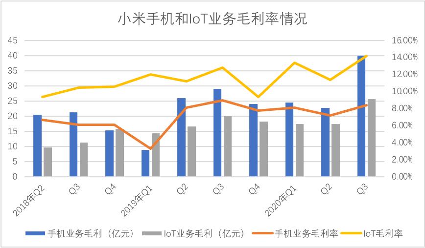 于是我们整理了手机和IoT业务的毛利率变化情况,见下图