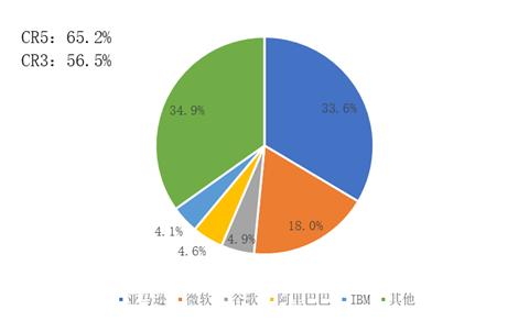 PaaS与IaaS一起,可归类为云计算基础设施服务,呈现出与IaaS服务十分相似的竞争格局。2019年,全球云基础设施服务市场前五名分别为亚马逊(33.6%),微软(18%),谷歌(4.9%),阿里巴巴(4.6%)和IBM(4.1%),CR5合计市场份额65.2%,CR3合计市场份额56.5%。