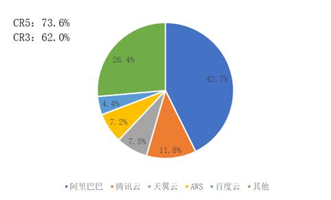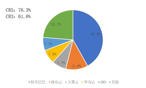 2018年下半年,中国云基础设施服务市场前五名分别为阿里巴巴(42.7%),腾讯(11.8%),天翼云(7.5%),AWS(7.2%)和百度云(4.4%),CR5合计市场份额73.6%,CR3合计市场份额62%。2H19,中国云基础设施商场格局有所变化,前五名分别为阿里巴巴(41.9%),腾讯(12%),天翼云(7.7%),华为云(7.6%)和AWS(7.1%),CR5合计市场份额76.3%,CR3合计市场份额61.6%。