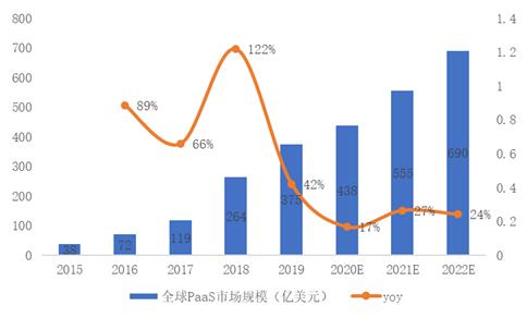 根据Gartner的数据统计,2019年全球PaaS服务市场规模达到375亿美元,相较于2018年的264亿美元增长了42%。预计到2022年,全球PaaS服务市场规模可达690亿美元,2019-2022年复合增长率23%。