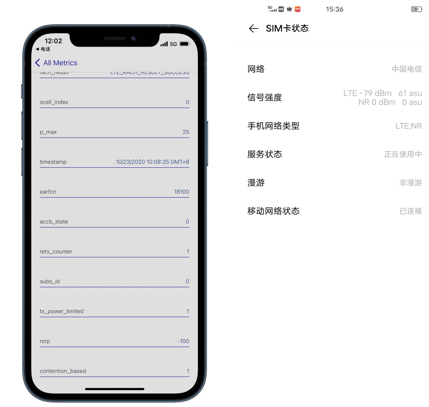在室内信号较弱的环境下,iPhone 12 Pro和iQOO 5均开启5G模式,并使用同一张电信5G SIM卡,测得手机信号强度数据显示,iPhone 12 Pro的信号强度为-100dBm,而iQOO 5为-79dBm。