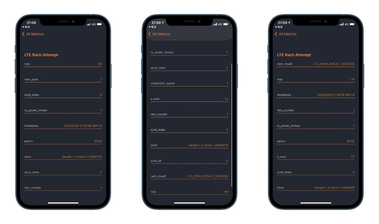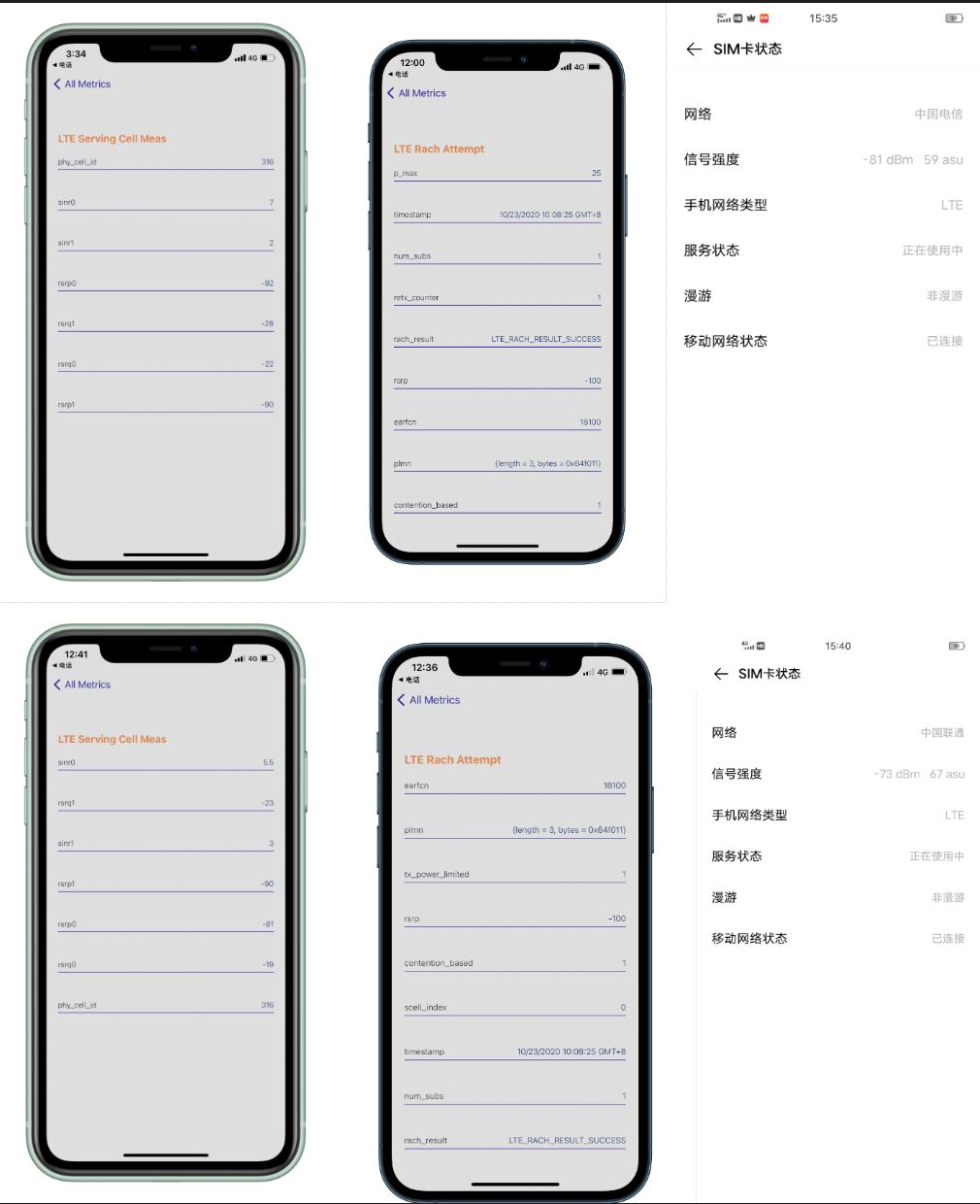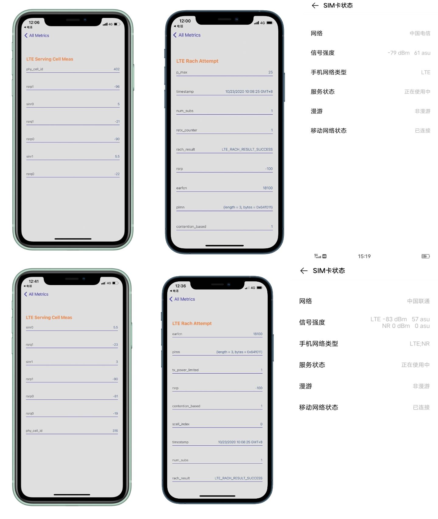 4G模式下,iPhone 11、iPhone 12 Pro、iQOO 5在室内测得的数据如下:不管插入电信还是联通5G SIM卡,iPhone 11和iPhone 12 Pro的信号强度都属于差的那一档,而iQOO 5的信号依旧是极好。