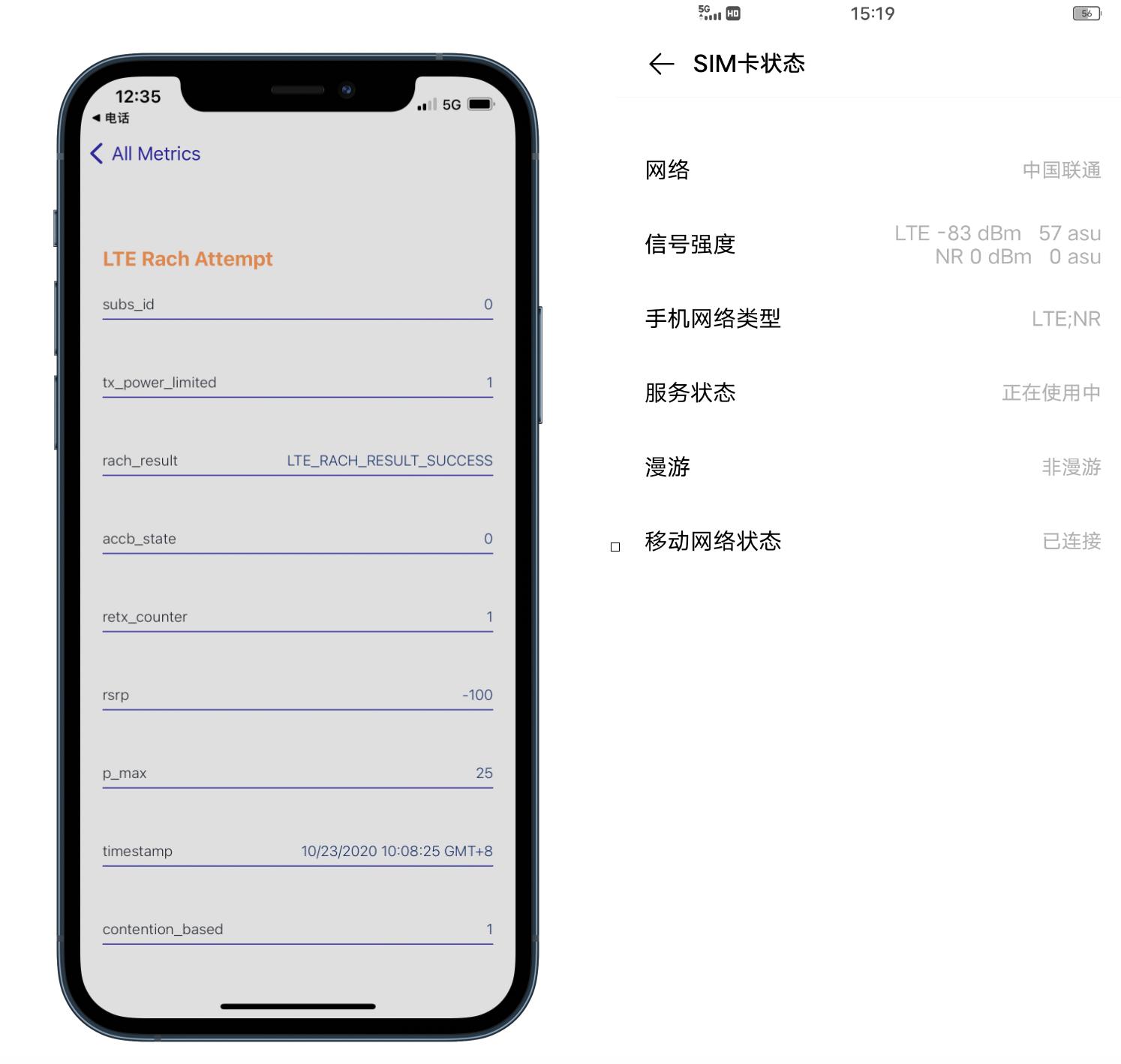 在同一测试环境下,我们将两台设备的SIM卡更换为联通,可以看到iPhone 12 Pro的RSRP依旧是-100dBm,不过屏幕右上角的信号标识减少了两格,而iQOO 5的RSRP为83dBm。这样看来,两台设备所处的地理位置,中国电信的信号覆盖会更好一些。