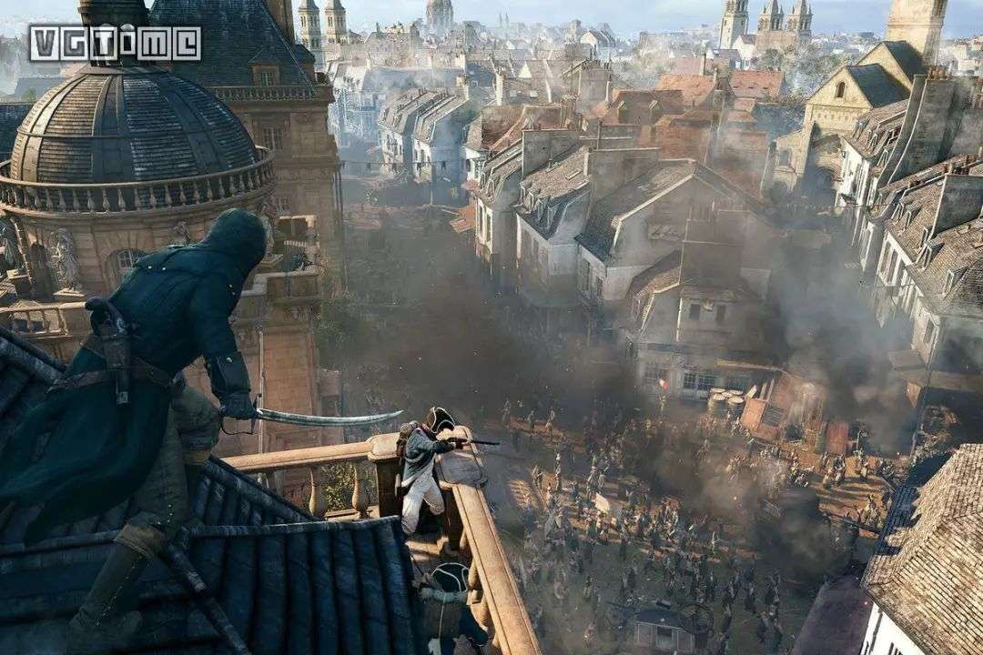 《刺客信条 大革命》(简称《大革命》)是育碧蒙特利尔为当时的次世代主机制作的系列革新之作,建模之精细环境之优美,仿佛 1789 年的巴黎就在眼前。毕竟是法国人自己的故乡。本作可谓是赌上了育碧扛把子 IP 之名,游戏中 NPC 数量之巨让无双游戏都为之汗颜,攀爬系统又再进化,从点对点的攀爬模式进入了随意攀爬的大自由境界,还有多人合作模式誓要为营收再添一把火。