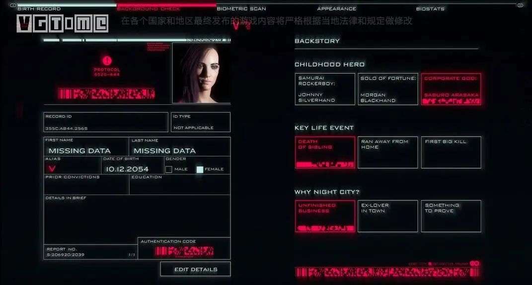 游戏本设计了三种背景故事,分别有“儿时英雄”“重大事件”“为何来到夜之城”三个部分,到实际游戏中成了三个出身,但除了进入夜之城的方式不同以及提供一些对话选项之外,再无其他作用。明明有各种派系却砍掉了帮派声望及相关剧情,本是一个因身怀重要芯片在各大派系中周旋展现出社会百态的故事变成了如今的模样。