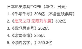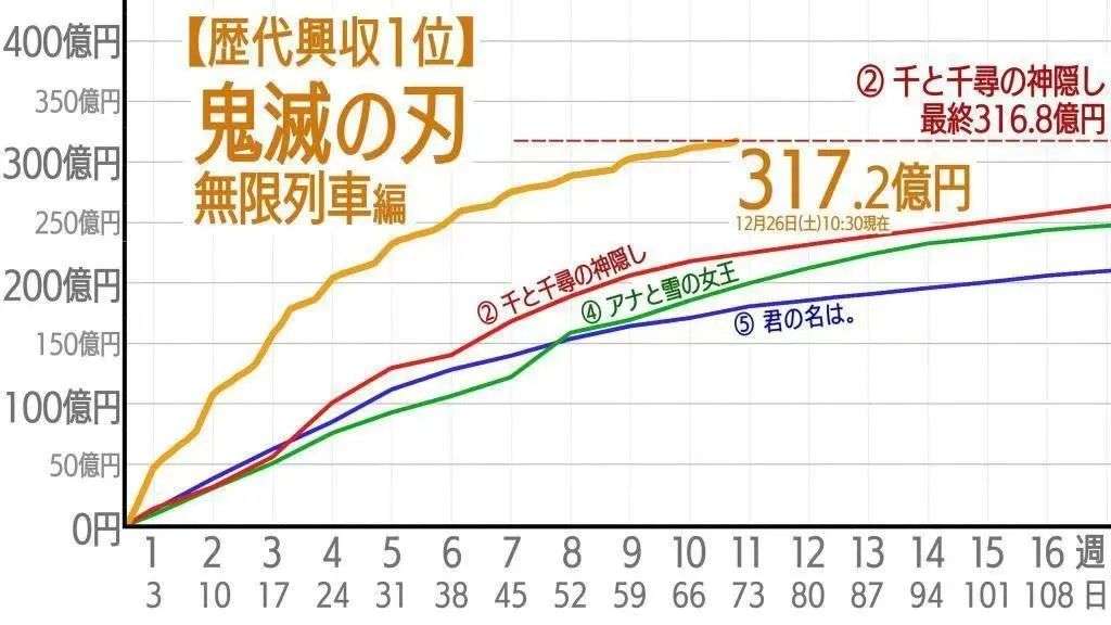 但这一举动仍是杯水车薪,仅仅11天后,也就是12月26日,该作彻底打破了千与千寻的票房记录,以317.2亿日元成了日本影史绝对的票房冠军。