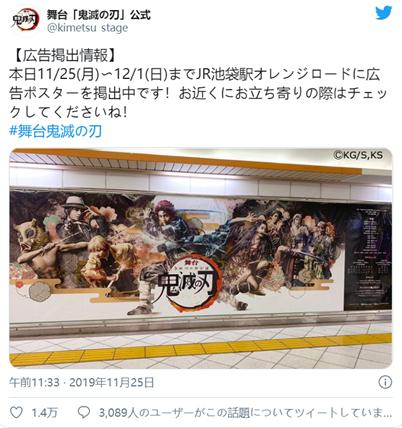 电视动画最终话和剧场版发表后的2019年11月25日,《鬼灭之刃》也在JR池袋站打下巨幅广告海报。