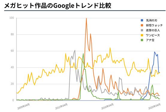 与线下情况产生呼应的,还有《无限列车篇》的线上影响力——以Google趋势为参照,《鬼灭之刃》的起势始于2019年4月(动画开始播出的时间点),花了一年时间就超越了其他人气作品……